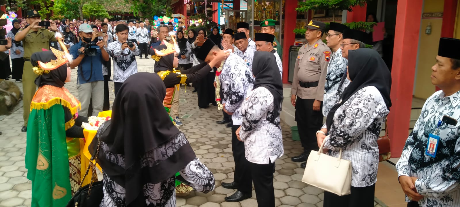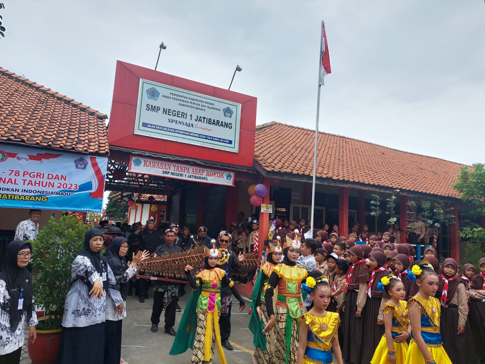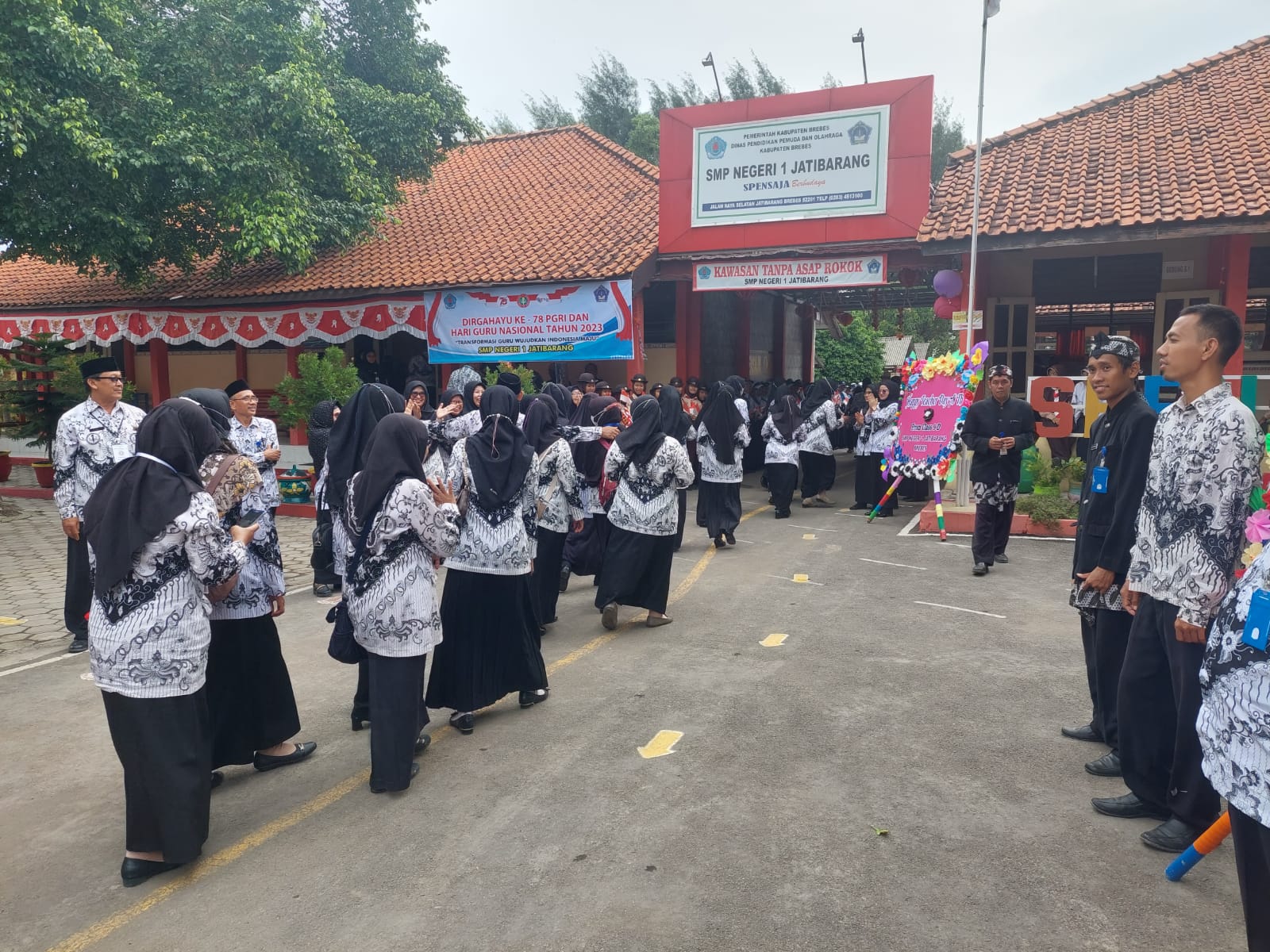 Kedatangan para peserta upacara HUT PGRI dan HGN ke SMP Negeri 1 Jatibarang-Brebes disambut oleh para siswa siswi SMP Negeri 1 Jatibarang-Brebes yang berderet membentuk barisan, lengkap dengan lambaian bendera merah putih di tangan mereka mulai dari gerbang depan sampai ke lapangan upacara. disepanjang jalan menuju lapangan upacara juga dihiasi dengan berbagai karangan bunga hasil karya siswa-siswi berisi ucapan selamat HUT PGRI ke -78 dan Hari Guru Nasional tahun 2023.