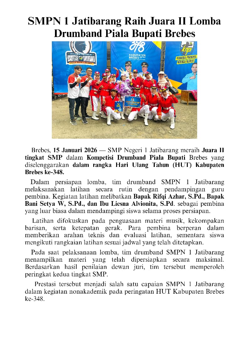 SMP N 1 Jatibarang Raih Juara II Lomba Drumband Piala Bupati Brebes